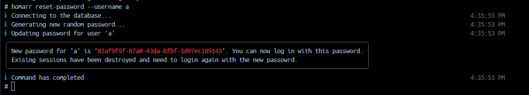 Using this command, you can forcefully reset the password of a user. It will be set to a random value and the hash for the user will be updated. All sessions for that user will be terminated and the user must re-login.